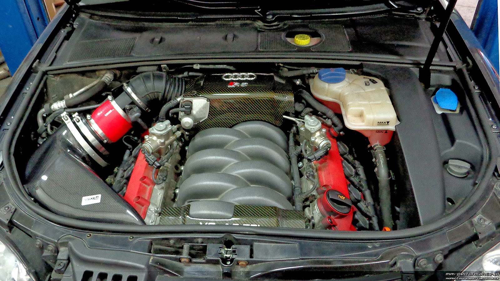 Niesamowicie zadbany egzemplarz Audi RS4 [B7 – Sedan] doposażony w elementy z najwyższej półki – czyli ciekawa realizacja MM-Performance.pl. Sportowy układ wydechowy wraz z zaimplementowanym systemem przepustnic i sekcją centralną oraz ceramicznymi końcówkami od renomowanego, niemieckiego producenta – firmy Capristo zastąpił nieciekawie wyglądający i brzmiący seryjny wydech. Redukcja masy, przyrost mocy a przede wszystkim niepowtarzalny, eskalujący do granic maksymalnych poziom dźwięku silnika w układzie V8. Dodatkowo, dzięki zaworom w tłumikach końcowych, kierowca w dalszym ciągu za pomocą przycisku „S” umiejscowionym na kierownicy ma prawo wyboru poziomu dźwięku – adekwatnie do warunków i sytuacji. Kompletny, sportowy układ dolotowy firmy GruppeM w kompletacji z stożkowym filtrem powietrza K&N oraz wykonanym z włókna węglowego airbox’em zastąpił seryjny system dolotowy w którym fabrycznie zainstalowany był papierowy filtr. Maksymalizacja dolotu zimnego powietrza do jednostki napędowej – gwarantowana, o aspektach wizualnych nie wspominając.
